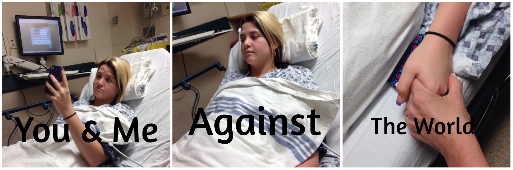 You and Me against the world Baby Girl. It’s always been just you and me fighting together. I love that you tried to do this by yourself to be strong and fight but sometimes we have to give in and let people take care of us. I’m sorry that all you’ve ever known is hospitals and doctors. I’m sorry that you didn’t live a normal life and childhood. I sit here going through all my phone photos, many through the years of you right here at this very hospital. Isn’t it odd that our memories are like this? As a mother you want to protect your child, keep them from harm but there were times I feel I failed at protecting you from the attack on your body. I’m thankful for doctors and nurses. When I noticed that you had on the same scrubs that everyone at the hospital wore, I realized something~it has all been worth it, the fight, the pain, all of it to see you become a nurse . The best part for me was when you started to fall asleep and you reached your hand out for me to take it, just like you did when you were little and you said, “Mommy I don’t want to ever leave you.” You and Me against the World Baby Girl. That’s what it’s about for me!