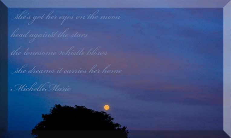 she’s got her eyes on the moon July 2, 2015February 18, 2016 | MichelleMarie she’s got her eyes on the moon head against the stars the lonesome whistle blows she dreams it carries her home MichelleMarie Feel free to share ღ Click to email a link to a friend (Opens in new window) Email Click to share on Facebook (Opens in new window) Facebook Click to share on LinkedIn (Opens in new window) LinkedIn Click to share on Tumblr (Opens in new window) Tumblr Click to share on Pinterest (Opens in new window) Pinterest Click to share on X (Opens in new window) X More Click to share on WhatsApp (Opens in new window) WhatsApp Click to print (Opens in new window) Print Click to share on Telegram (Opens in new window) Telegram Click to share on Pocket (Opens in new window) Pocket Click to share on Reddit (Opens in new window) Reddit Like Loading... Related